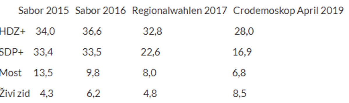 Das bipolare Parteiensystem, mit HDZ und SDP als den zwei dominanten Parteien, die sich (zusammen mit ihren Koalitionspartnern) an der Macht abwechseln, ist in den vergangenen Jahren zunehmend unter Druck geraten. Bereits in den Parlamentswahlen 2015 und 2016 konnten zwei neue populistische Parteien, die im Namen der Bürger gegen die etablierten Parteieneliten antraten, Wahlerfolge erzielen und ins Parlament einziehen. Die erste Partei ist Most („die Brücke“), die als Netzwerk von lokalen unabhängigen Listen enstand. Most trat zweimal der HDZ Regierungskoalition bei, jeweils mit dem Anspruch, (inhaltlich nicht präzisierte) Reformen durchzusetzen, wurde aber im April 2017 von Premierminister Andrej Plenković aus der Regierung entfernt. Seitdem hat sich Most immer stärker als katholisch-konservative Partei und erbitterter Kritiker der HDZ von rechts profiliert. Die andere populistische Partei ist Živi zid („Lebende Mauer“), die aus einer Bewegung zum Schutz der Bürger, die wegen säumiger Kreditzahlungen durch Zwangsräumungen gefährdet waren, entstanden ist. Živi zid ist ideologisch schillernd, verbindet aber in ihrem Programm euroskeptische und antikapitalistische Elemente.