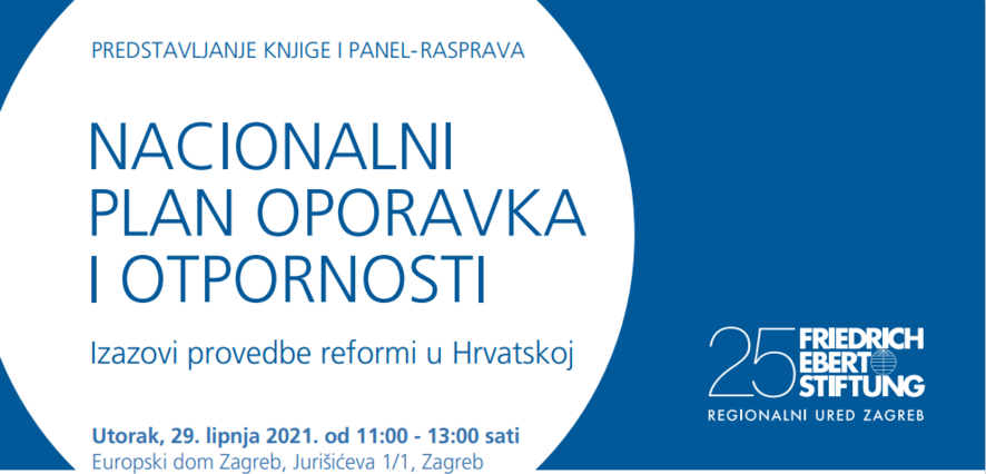 Što donosi Nacionalni plan za oporavak i otpornost i hoće li on potaknuti reforme? Koji su ključni prioriteti postavljeni u ovom planu? Po čemu je ovaj mehanizam različit od svih dosadašnjih instrumenata Europske unije? Odgovaraju li ovi prioriteti potrebama radnika, tržištu rada, gospodarstvu, poduzetnicima, socijalnom sustavu i sustavu obrazovanja? Na koji način socijalni partneri, stručnjaci i akademska zajednica gledaju na ciljeve plana te kako je kriza koronavirusa promijenila percepciju toga što su najvažniji problemi s kojima se Hrvatska suočava? O tim pitanjima debatirat ćemo na panel raspravi u torak, 29. lipnja 2021. od 11:00 - 13:00 sati, Europski dom Zagreb, Jurišićeva 1/1, Zagreb.