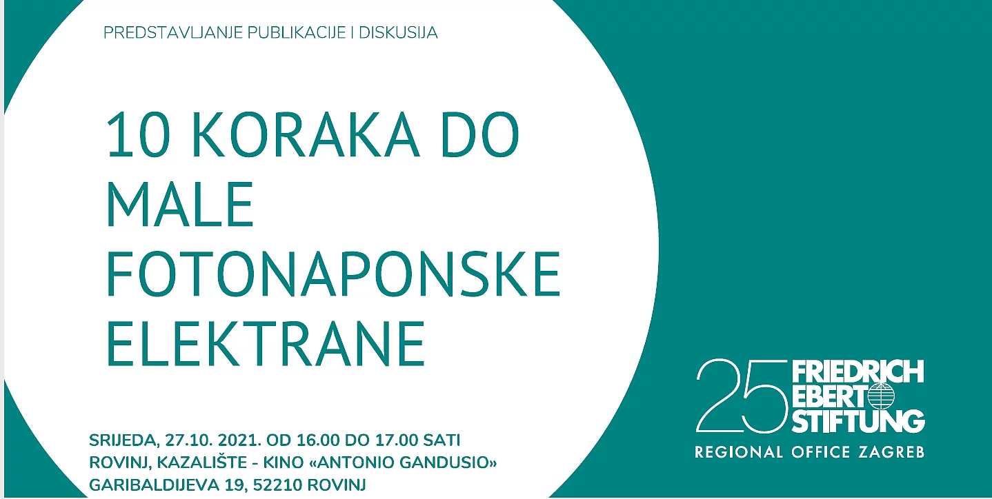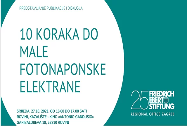 10 koraka do male fotonaponske elektrane Pozivamo vas u srijedu, 27.10.2021. od 16 do 17 sati u Rovinju, kazalište-kino Anonio Gandusiona, na predstavljanje publikacije "Moja energija, moja sloboda" u kojoj je u deset koraka opisan proces postavljanja male fotonaponske elektrane te ćemo razgovarati i o energetskim zadrugama i zajednicama. Program