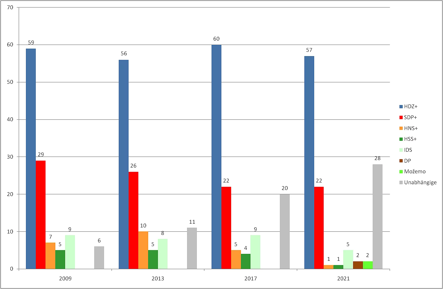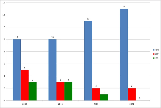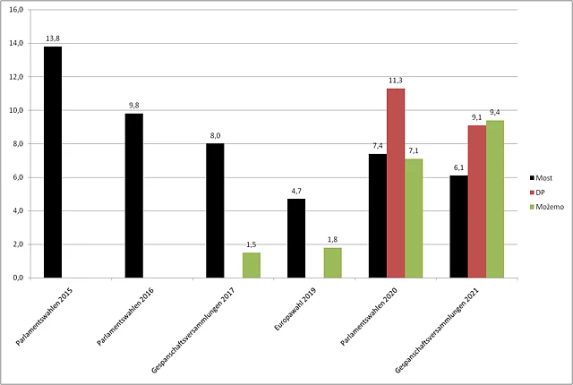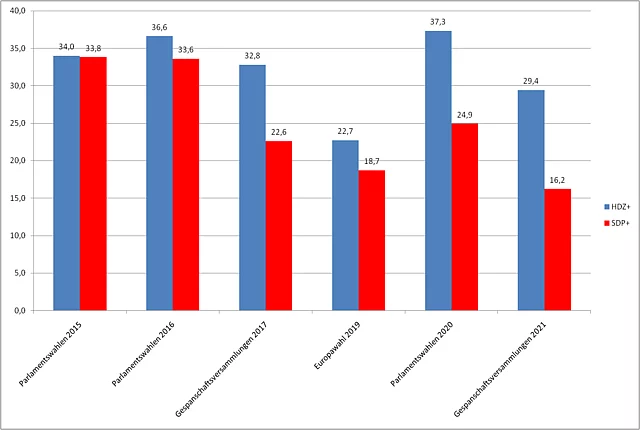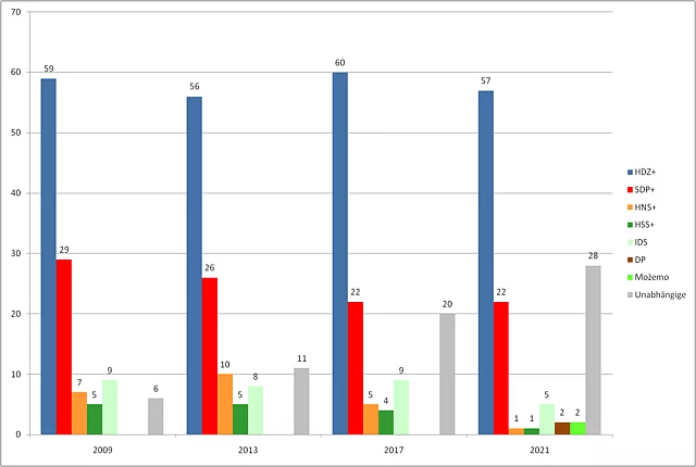 Blickpunkt Kroatien Blickpunkt Kroatien br. 1/2021 04.06.2021 Die Politik in Kroatien war im Mai 2021 zum einen von der abflauenden Pandemie und der Vorfreude auf eine bessere Tourismussaison und zum anderen von den Kommunal- und Regionalwahlen geprägt. Sichtbarstes Symbol einer Aufbruchstimmung ist der fulminante Wahlsieg von Tomislav Tomašević in Zagreb, der mit einer grün-alternativen Liste das Thema nachhaltige und transparente Stadtpolititk ins Zentrum seiner Politik rückte und damit die Köpfe und Herzen der Menschen gewann. Als Oberbürgermeister der Hauptstadt, die gleichzeitig auch das Wirtschaftszentrum Kroatiens ist, wird er es nicht leicht haben, den seit Jahrzehnten grassierenden Filz zu bekämpfen und eine zukunftsfähige grüne Stadtpolitik zu machen. Einziger Trost der Sozialdemokraten (SDP), deren Kandidat lediglich auf Platz fünf kam, liegt in der Perspektive, dass sie als Koalitionspartner des neuen OB die Geschicke Zagrebs mitbestimmen dürfen. Was die Wahlergebnisse uns im Detail sagen, erfahren Sie in der neuesten Ausgabe unseres Blickpunkt mit Beiträgen von Nenad Zakošek und Vedran Đulabić Inhaltsverzeichnis der Ausgabe 1/2021 1. Gewinner und Verlierer der Wahlen 2. Das kroatische System der lokalen und regionalen Selbstverwaltung bei den Wahlen 2021 Gewinner und Verlierer der Wahlen Die Lokal- und Regionalwahlen im Mai haben die kroatische Parteienlandschaft verändert von Nenad Zakošek Am 16. und 30. Mai (zweiter Wahlgang) fanden in Kroatien Lokal- u Regionalwahlen statt, die das kroatische Parteiensystem verändert haben. In den 428 Gemeinden, 128 Städten und 20 Gespanschaften (in Kroatisch županije, Einheiten der regionalen Selbstverwaltung) wurden Gemeinde- und Stadträte, Abgeordnete der Gespanschaftsversammlungen sowie Gemeindevorsteher, Bürgermeister und Gespane (regionale Gouverneure) gewählt. Die Wahlergebnisse auf der Ebene Gespanschaft werden in Abbildung 1 gezeigt. Die bei Lokal- und Regionalwahlen lag insgesamt bei knappn 47 Prozent (Abbildung 6). Die konservative Kroatische Demokratische Gemeinschaft (HDZ) ist mit 29,4 Prozent der Stimmen als stärkste Partei aus den Wahlen hervorgegangen. Allerdings verlor die Partei von Ministerpräsident Andrej Plenković im Vergleich zu den Parlamentswahlen im Juli 2020 mehr als ein Fünftel der Stimmen. Zugleich vergrößerte sie aber den Vorsprung vor ihrem Hauptkonkurrenten, der Sozialdemokratischen Partei Kroatiens (SDP), auf mehr als 13 Prozentpunkte. Die Kandidaten der HDZ gewannen den Vorsitz in 15 Gespanschaften, das ist ihr bestes Ergebnis seit 2009, als die Direktwahl der Gespane eingeführt wurde (Abbildung 4). HDZ-Kandidaten gewannen auch 57 Bürgermeisterposten, drei weniger als vor vier Jahren (Abbildung 5). HDZ bleibt stärkste Partei und kann ihren Vorsprung vor SDP vergrößern Die Sozialdemokraten gewannen 16,2 Prozent der Stimmen in den Wahlen für die Gespanschaftsversammlungen und erzielten damit das schlechteste Wahlergebnis seit den 1990-er Jahren. Dieses Resultat der SDP ist eine Folge von zwei Umständen: erstens haben sich innerparteiliche Spannungen und Konflikte in der SDP fortgesetzt und vor der Wahl noch verschärft. Der im Oktober 2020 gewählte SDP-Vorsitzende Peđa Grbin genießt keine ungeteilte Unterstützung in der Partei. Zweitens ist zum ersten Mal eine glaubhafte politische Alternative links von der SDP in der Form des Wahlbündnisses Možemo! aufgetreten und konnte in den sechs Gespanschaften, wo sie ihre Listen aufstellten, einen Teil der SDP-Wähler anziehen. Als Trost kann der SDP die Tatsache dienen, dass sie die zwei Gespansposten in der Krapinsko-zagorska und der Primorsko-goranska Gespanschaft erneut erobern konnte und weiterhin in 22 Kommunen den/die Bürgermeister/in stellt (Abbildungen 4 und 5). Neue politische Akteure links von der SDP und rechts von der HDZ gewinnen an politischem Boden In den letzten zwei Jahrzehnten bildeten HDZ und SDP ein Duopol im kroatischen Parteiensystem. Sie traten allein oder mit Koalitionspartnern in den Wahlen auf verschiedenen Ebenen des politischen Systems auf und gewannen zusammen über 50 Prozent der Stimmen. In den letzten Jahren ist die dominante Position der HDZ und SDP ins Wanken geraten, diesmal gewannen beide Parteien zusammen nur rund 45 Prozent der Stimmen (Abbildung 2). Neue politische Konkurrenten rechts und links von den beiden Parteien versuchen, einen Teil ihrer Wähler anzuziehen. Zuerst betrat 2015 die Partei Most als neue konservative Kraft rechts von der HDZ die politische Arena und erzielte in den Parlamentswahlen ein sehr gutes Ergebnis (Abbildung 3). Damals nutzte Most die Tatsache aus, dass keine der beiden großen Parteien ohne ihre Unterstützung die Regierung bilden konnte und trat in eine kurzlebige Koalitionsregierung mit der HDZ ein. Das Scheitern der Regierung im Juni 2016 bedeutete das Ende der politischen Karriere des HDZ-Vorsitzenden Tomislav Karamarko, der die HDZ mit einer rechtspopulistische Agenda stark nach rechts geführt hatte. Zwar trat nach den vorgezogenen Parlamentswahlen 2016 Most erneut in eine Koalitionsregierung mit der HDZ ein, wurde aber ein halbes Jahr später vom Ministerpräsidenten Andrej Plenković aus der Regierung entlassen. Seit 2020 konkurriert auch die Heimatbewegung (DP) von Miroslav Škoro um Stimmen rechts von der HDZ. Die neuesten Wahlen bestätigten die Position der Most und der DP im kroatischen Parteiensystem. Beide Parteien konnten zusammen rund 15 Prozent der Stimmen gewinnen. Auf der anderen Seite des politischen Spektrum ist zum ersten Mal in den Lokal- und Regionalwahlen 2017 das Wahlbündnis Možemo! in der Hauptstadt Zagreb aufgetreten. Die Wahlplattform von linken und grünen Aktivisten trat in der Hauptstadt als Alternative zu dem langjährigen Bürgermeister Milan Bandić an, der im Jahr 2000 als Kandidat der SDP gewählt worden war und 2010 seine eigene Partei gründete. Er regierte seitdem über ein klientelistisches Modell der Politik und