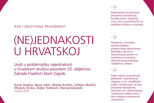 Publikacije (Ne)jednakosti u Hrvatskoj (Ne)jednakosti u Hrvatskoj Doolan, Karin ; Jokić, Boris ; Kroflin, Matija ; Mačkić, Velibor ; Šinko,Marjeta ; Tonković, Željka ; Zakošek, Nenad Kako Hrvatska stoji po pitanju jednakosti i društvene pravde? Povodom obilježavanja naše 25. obljetnice zamolili smo istaknute stručnjake da analiziraju ekonomsku i rodnu nejednakost, kao i klasne nejednakosti te ulogu i učinke političkog i obrazovnog sustava u tom kontekstu. Pogledajte njihov uvid u problematiku. Publikaciju preuzimite ovdje.