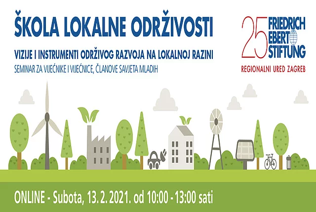 Online seminar: Škola lokalne održivosti 02/12/2021 23:00 to 01/01/1970 00:00 - Online Škola lokalne održivosti U subotu 13. veljače 2021. organiziramo seminar pod nazivom Škola lokalne održivosti za gradske vijećnice i vijećnike, članove savjeta mladih, kao i ostale zainteresirane osobe. Ovim seminarom želimo potaknuti diskusiju o boljoj, zelenoj budućnosti, kao i tranziciji koju je potrebno provesti u gradovima i općinama. Prijave na seminar primamo do 10.2.2021. putem linka https://bit.ly/3qWgwBQ Program