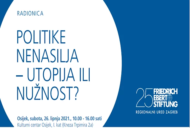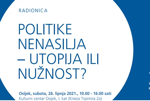 Politike nenasilja– utopija ili nužnost? Ova je radionica dio edukativnog programa ustanove Politike nenasilja iz Osijeka u suradnji sa Zakladom Friedrich Ebert u Zagrebu. Ona je druga od četiri u nizu. Cilj ovih radionica je okupiti zainteresirane pojedinke/ce koji žele primjenjivati i učiti pristupe lokalnim politikama temeljene na suradnji, uključivanju građana, transparentnosti, te izgraditi neformalnu mrežu unutar koje će se osmišljavati zajednički odgovori postojećim i novim izazovima, poput pandemije i klimatskih promjena. Pozivamo Vas na radionicu u Osijeku, u subotu, 26. lipnja 2021., od 10.00 - 16.00 sati u Kulturnom centaru Osijek, I. kat (Kneza Trpimira 2a. Za prijavu spunite online prijavnicu: forms.gle/15pbmmJ1DRCX3Faq5 najkasnije do ponedjeljka 21. lipnja 2021. Program radionice