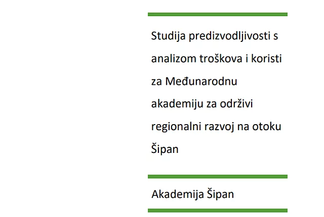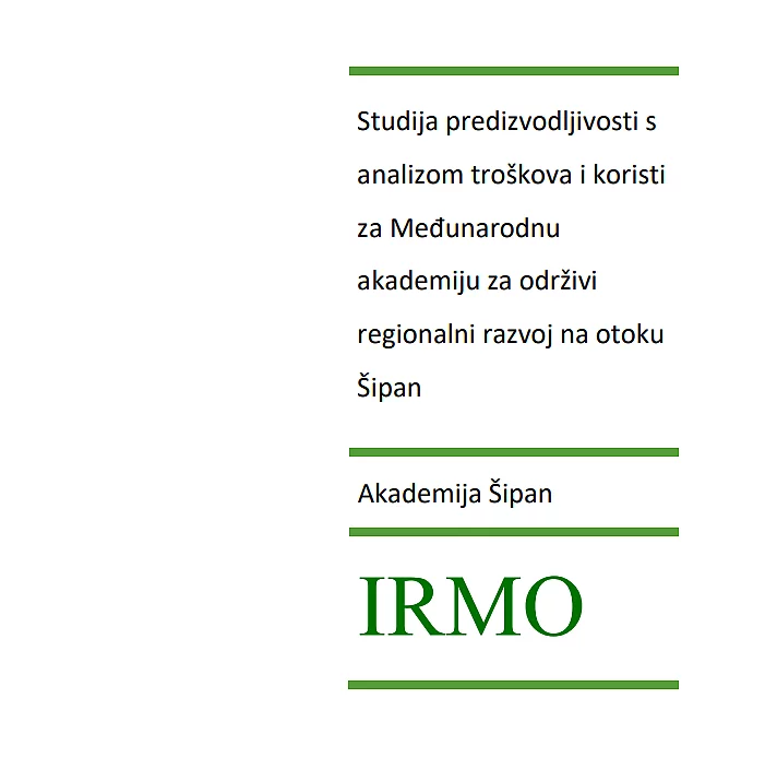 Studija predizvodljivosti s analizom troškova i koristi za Međunarodnu akademiju za održivi regionalni razvoj na otoku Šipan Na inicijativu njemačko-hrvatske građanske inicijative za osnivanje Međunarodne akademije za održivi regionalni razvoj na otoku Šipanu u Hrvatskoj, Institut za razvoj i međunarodne odnose, uz financijsku potporu Zaklade Friedrich-Ebert-Zagreb, pripremio je studiju predizvedljivosti. Studija postavlja niz pitanja kako u pogledu cilja, tako i lokalnog sidrenja i infrastrukture. Studija prikazuje scenarije mogućeg daljnjeg razvoja projekta. Studiju preuzmite ovdje