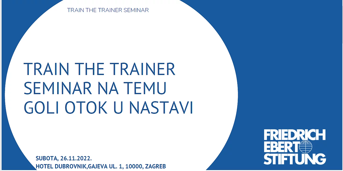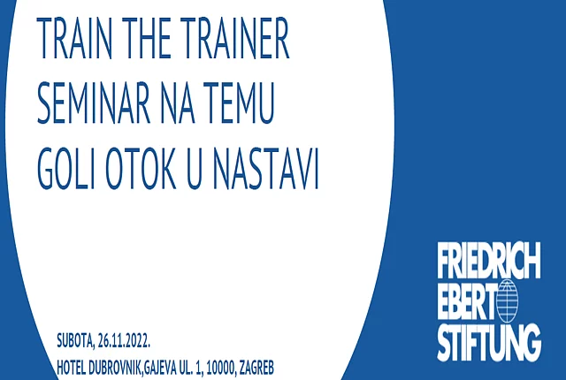 Train the Trainer seminar na temu Goli otok u nastavi Seminar se održava 26.11.2022. u Zagrebu i namijenjen je nastavnicima, profesorima i drugim predavačima koji temu “Golog otoka” žele obraditi u sklopu formalnog ili neformalnog obrazovanja srednjoškolaca, studenata ili odraslih osoba. Poziv za prijavu upućuje se zainteresiranim sudionicima iz Hrvatske i zemalja Zapadnog Balkana. Radni jezik seminara je hrvatski / BCHS. Broj mjesta je ograničen te Vas molimo da se u slučaju interesa što prije prijavite za sudjelovanje. Ispunjenu prijavnicu i eventualna pitanja pošaljite na adresu boris.stamenic(at)fes.hr Prijavnica Program